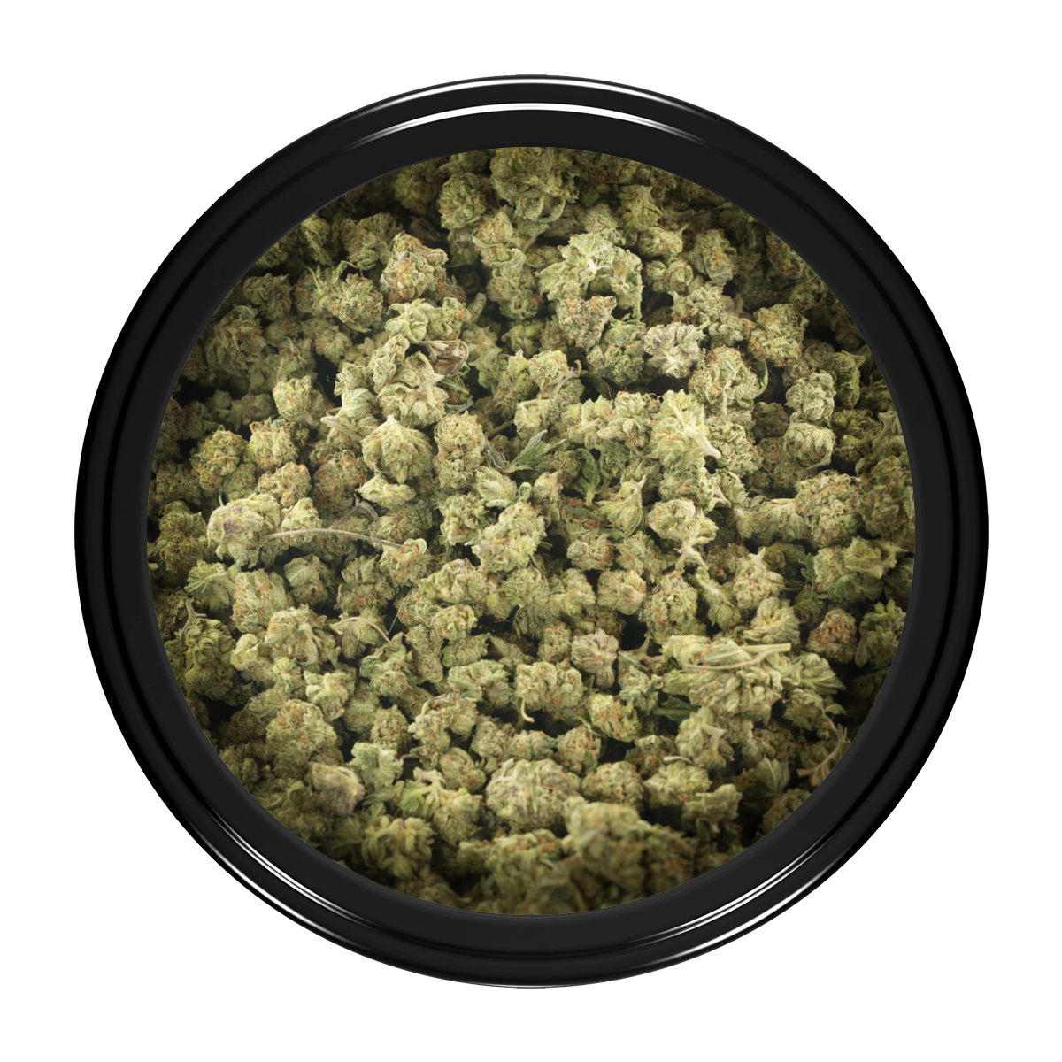 The popcorn buds are small yet dense, with deep green colouring accented by rusty orange pistils and a heavy dusting of sticky trichomes. Despite their size, these buds pack the same potency and resin-rich structure as larger flowers, making them a perfect choice for indica lovers seeking high value and strong effects.
